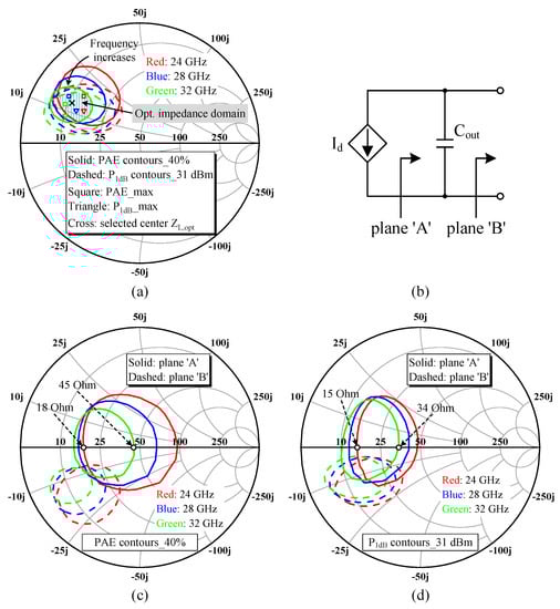 For subsequent analyses and the design of broadband MNs, we needed to derive the parallel RoutCout model for the large-signal output impedance of the cell, in which the extraction of Cout is particularly vital. Assume that the load-pull simulation is performed at the transistor’s internal current source, i.e., reference plane ‘A’ in Figure 5b; the resulting contour will become frequency-independent regardless of any parasitic reactance, and its center will fall on the real axis of the Smith chart, implying that the ideal closed contour will be bisected by the real axis [20]. Based on this conclusion, we can use Equation (8) to calculate the shunt capacitance, Cp, corresponding to the conjugate of ZL,opt and take it as an initial guess for Cout (0.26 pF @ 28 GHz); then, we can try de-embedding different Cout values from the load-pull contours derived at plane ‘B’ one by one in steps of 0.01 pF. When the extracted efficiency and power contours are shifted back to the position symmetrical to the real axis [18], as illustrated in Figure 5c,d, the Cout is identified to be 0.27 pF. Additionally, the acceptable load resistance RL ranges between 18 and 34 Ω.