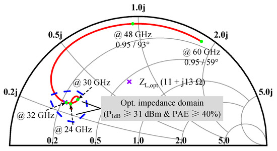 Figure 7 shows that the input reflection coefficient of OMN rotates clockwise with increasing frequency in the previously determined optimal impedance domain and forms a knot at 24–31.5 GHz, while the second harmonic impedance varies along the periphery of the Smith chart. Moreover, the impedance at 32 GHz highly coincides with ZL,opt, which guarantees the PAE level at high frequencies.