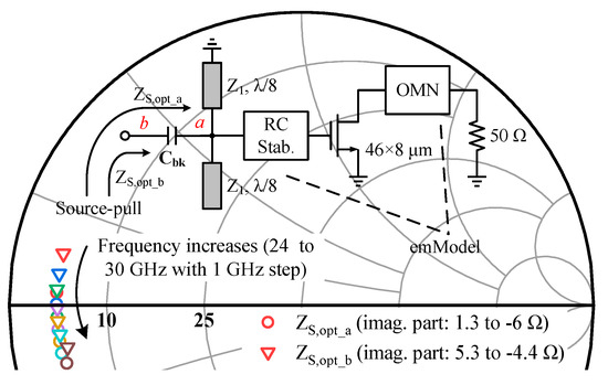 To quantify the impact of the RC stabilization network on the matching bandwidth, using Equations (1) and (2), the channel resistance, Ri, and the depletion capacitance, Cgs, of the 46 × 8 μm cell are found to be 5.3 Ω and 0.655 pF, respectively, extracted from the S-parameter simulation at f0 (27 GHz) based on the simplified hybrid-π model of a FET [13].