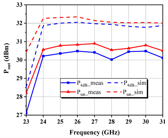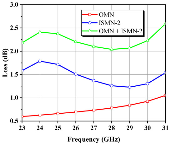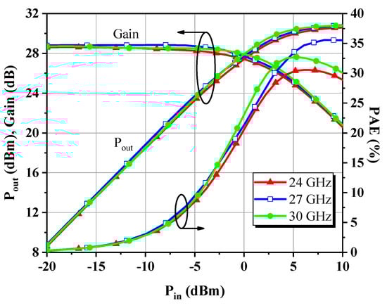 After replacing the ISMN-2 into a layout and cascading it with corresponding cells and OMN, we evaluated the total losses associated with each MN, including mismatch and dissipative loss, by injecting a fixed low-power stimulus signal to the interstage cell and calculating the power difference between their input and output ports. The simulation results are displayed in Figure 10. OMN loss increases monotonically in the designed band, with the maximum value not exceeding 1 dB, while the loss curve of ISMN-2 follows a decreasing and then increasing trend, with the valley point located at 29 GHz, and the sum of all losses introduced by both is controlled within the range of 2–2.4 dB. Since the design of the latter two MNs emphasizes achieving better Pout and PAE metrics, compensation for the transistor’s gain roll-off is very limited.