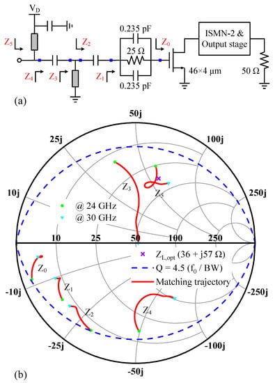(a) Schematic of the ISMN-1. (b) Matching trajectory along the ISMN-1 within the 24–30 GHz bandwidth.