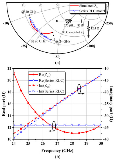 The input impedance, Zin, of the first stage cell with stabilization circuits is plotted in Figure 12a and is represented by the red line. As the frequency increases, Zin moves up along the resistance circle of 12.4 Ω within the range of 26–30 GHz, which can be considered as a series RLC resonant circuit, where the inductance and capacitance values were determined to be 275 pH and 82 fF, respectively. Although this model does not fit well with the variation trends observed in Zin at lower frequencies, owing to irregular changes in the real part of Zin over the band revealed in Figure 12b, it is in good agreement with the imaginary part of Zin, and, as such, we can conclude that LC resonance is the most dominant form of Zin’s reactance.