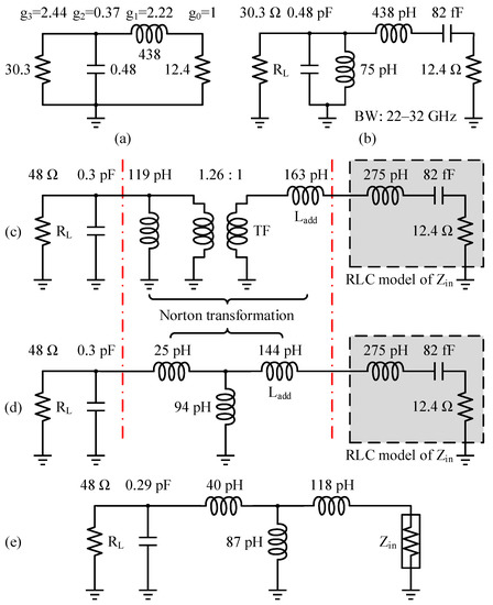 To start with, the influence of the L-type MN composed of a 1.8 pF DC-block capacitor and the parasitic shunt capacitor of the RF signal pad on an external 50 Ω load at both the input and output terminations was compensated by a high-impedance microstrip line to 48 Ω at 27 GHz. At least two sections of the LC ladder are needed for the Chebyshev filter-based OMN to achieve a transformation ratio of 4.4:1 throughout the target band with a passband ripple less than 0.1 dB, as expressed theoretically in [6]. To facilitate the determination of the normalized g elements through the look-up table, we set the impedance transformation ratio, r, as 4 and the FBW as 0.4 to ensure a sufficient design margin. The generated fourth-order low-pass prototype shown in Figure 6a can be converted into a specific network by inverse normalization Equations (10) and (11).