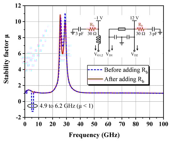 Afterward, the stagger-tuning technique was undertaken to optimize the insertion loss of each MN according to their passband properties; the broadband gain response was able to be achieved eventually. To thoroughly check the overall stability of the PA before tape-out, we conducted a series of EM/circuit co-simulations in the wide frequency region from DC to 100 GHz for various possible situations, including different bias voltages and power excitation. The case encountered that μ was less than unity in the 4.9–6.2 GHz range, as shown in Figure 14. Even though the stability of all unit cells was well assured in advance, the shared unilateral supplies, parasitic feedback loops, and coupling effects caused by the compact layout still triggered the formation of new potential instability in the cascaded circuit. Because of this, a 30 Ω resistor, Rb, was added in series with the 3 pF bypass capacitor in both the gate and drain bias paths of the driver stage to eliminate unfavorable oscillations. Figure 15 presents the final schematic of the designed broadband PA.