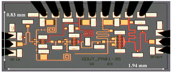 Figure 16 shows the proposed MMIC PA fabricated with the industrial 100 nm double heterojunction AlN/GaN/AlGaN HEMT process on a high-resistivity (5 kΩ/cm), 100-μm-thick silicon substrate. Under a 12 V pulsed supply with a 5% duty cycle (200 μs pulse width, 4 ms period) for drains of all stages to avoid overheating during continuous on-wafer testing, as the thermal contact of the chip’s backside on the heat sink is poor, the gate bias voltage was slowly raised from the −1.5 V threshold level until the quiescent current draw reached 211 mA, consistent with the simulation environment.