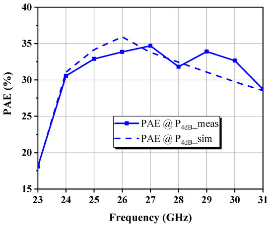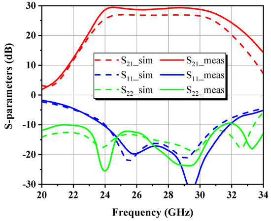 After calibrating out the losses of coax cables and GSG probes (150 μm pitch), Figure 17 exhibits that the measured input and output return loss are both greater than 10.5 dB, as well as a linear gain exceeding 28.6 dB over 24–30 GHz with 0.8 dB total variation. The pulsed test outcomes recorded by a vector network analyzer (Keysight N5245A PNA-X) agree nicely with simulations in continuous-wave (CW) mode, with the exception of S21, which is higher than predicted from 23.5 GHz onwards. Moreover, no oscillations arise, and the out-of-band gain drops substantially as intended thanks to the filter-based MNs; such band selectivity eases the later transmitter build-up.