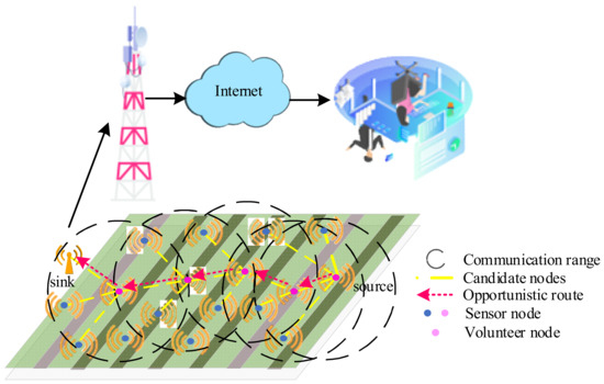 In view of the instability of transmission in the agricultural environment, the research on how to use WSN to effectively transmit agricultural information has attracted many researchers. The energy consumption, transmission delay, and throughput have an important impact on the network lifetime and monitoring quality. Changes in wireless signal strength under different agricultural scenarios were measured by Cama-Pinto [7] and Raheemah [8]. The signal attenuation model of the farmland ZigBee network was established by using a particle swarm optimization algorithm, which provided a reference for building a monitoring network [9]. Different transmission routing will produce different signal attenuation and affect the WSN lifetime. There were many wireless sensor routing algorithms for the agricultural environment [4]. A routing protocol based on a frontward communication area for collecting climate information in the agricultural field was proposed by Khan et al. [10]. Based on the communication radius, the candidate set in the forward communication range was determined. Then, the residual energy was used to select a node to reduce the energy consumption and time delay. The energy centroid was calculated, and nodes close to the energy centroid were regarded as cluster heads [11]. This method balanced the energy consumption and prolonged the network lifetime. However, traditional deterministic routing protocols have many limitations in dealing with unstable links [12]. The studies [13,14,15] showed that opportunistic routing strategies are used more and more widely. It makes full use of the broadcast characteristics and has an obvious advantage over traditional routing in solving unreliable links. Opportunistic routing protocol no longer fixes the next node, but selects many next hops, thereby improving performance such as network throughput.