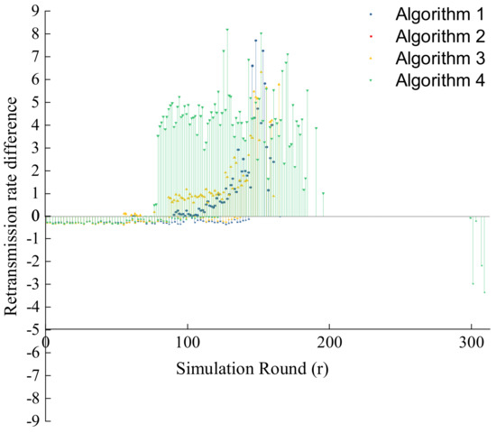 As the number of dead nodes increases, the retransmission rates of the five opportunistic routing algorithms all increase. Figure 9 shows the difference between the four comparison algorithms minus the retransmission rate of the algorithm in this paper. This algorithm considers the influence of nodes on network connectivity. The opportunistic routing not only focuses on the quality of the current forwarding path but also considers the long-term transmission quality of the network.