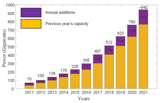Solar PV global capacity and annual additions, 2011–2021 [3].