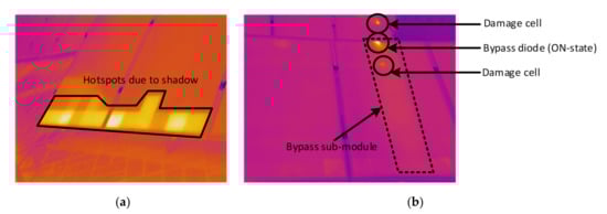 Infrared images: (a) shadow from front row PV modules and (b) damage PV cell in a PV module.