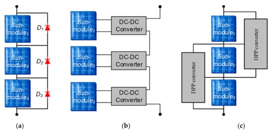 Usually, a PV module consists of series-connected solar PV cells; as a result, a mismatch caused by a single cell affects the whole PV module. In order to limit the effect of mismatch, there are various solutions, e.g., bypass diodes method [18] (shown in Figure 4a), DC optimizers [19,20] (shown in Figure 4b), and differential power processing (DPP) converters [21,22,23,24,25] (shown in Figure 4c). The traditional method to limit mismatch effects is the inclusion of bypass diodes into the PV module. Bypass diodes are parallel-connected to a group of series-connected PV cells [26], dividing the whole PV module into more sub-modules.