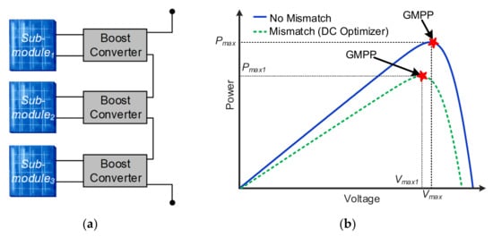 In addition to bypass diodes methodology, distributed maximum power point tracker (dMPPT) methods have been used to eliminate the electrical characteristic mismatch problems in the solar PV systems [29,30,31,32]. The commonly used dMPPT methodologies are DC optimizers [33,34,35] and DPP converters [24,36,37,38,39,40]. The general schematic of DC optimizer and DPP converters are shown in Figure 4b,c. In DC optimizers each PV sub-module is connected to a DC-DC converter, which processes a complete power, and each PV sub-module is operating at its maximum power point (MPP). However, the DC optimizer’s power losses reduce the overall efficiency when there is no mismatch [41], which is when the DC optimizers would not be necessary. Additionally, DC optimizers also increase the cost of the system and could reduce long-term reliability. PV modules, including DC optimizers, may be suitable solutions for residential PV systems, which are prone to heavy mismatch losses due to partial shading, but they are not the best solution for large PV generators due to the increased cost and the low probability of mismatch.