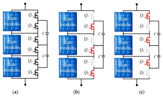 Furthermore, there are various kinds of DPP converter topologies from which the PV is connected to another PV (PV-PV) DPP converter topologies, and they are the most famous because they require fewer power converters than the other DPP converters. Additionally, the PV-PV DPP converters are independent of bus voltage and do not need to withstand the high-voltage stresses, as compared to other DPP topologies. Generally, each DPP converter is connected between two PV sub-modules, as shown in Figure 4c. Furthermore, these DPP converters are bidirectional and can supply as well as remove the current, which is needed for PV sub-modules to maintain their operation at their MPPs. Some of the commonly discussed PV-PV DPP topologies are energy recovery [58], buck-boost [59], and switched-capacitor (SC) [60]. In this study, SC-based DPP converter topology is considered for analysis, and the general schematic of the topology is shown in Figure 7a. The SC-based DPP topology has two states of operation, as shown in Figure 7b (state/mode 1) and in Figure 7c (state/mode 2). In state 1, the even-numbered switches (Q2, Q4, and Q6) are ON and the odd-numbered switches are OFF (Q1, Q3, and Q5), as depicted in Figure 7b. During that state, the mismatched energy is stored by the capacitors (C). However, this energy is released in the second state/mode of operation of the SC-based DPP converter, where the odd-numbered switches (Q1, Q3, and Q5) are ON and even-numbered (Q2, Q4, and Q6) are OFF, as shown in Figure 7c. The more detailed working principle is given in [60].
