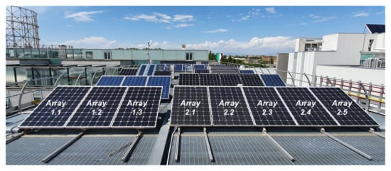To compare different mismatch reduction techniques with a real PV system in a field, the group of five 245 Wp monocrystalline PV modules, shown in Figure 9, is considered [63]. These modules are identified by the labels Array 2.1, Array 2.2, Array 2.3, Array 2.4, and Array 2.5, and their ratings are given in Table 2. The DC power recordings taken during the year 2017 are considered and compared with the model presented in the next section by considering similar irradiance and temperature profiles.