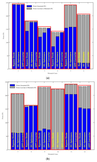 Power generated and lost under mismatch cases: (a) Cases 1–6 and (b) Cases 7–10.