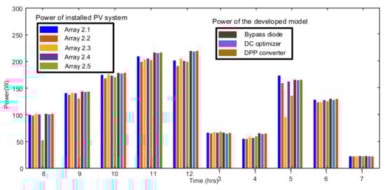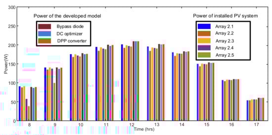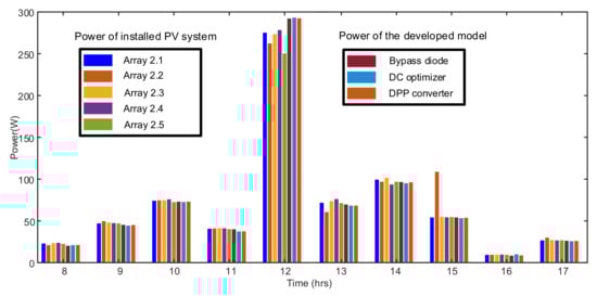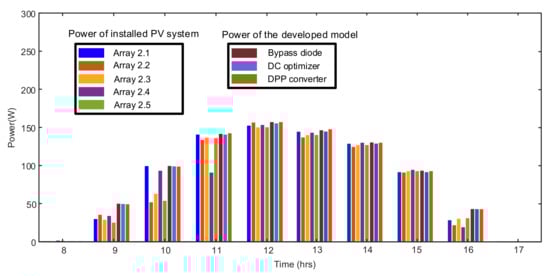 The model also is verified through the five different PV systems installed at SolarTechLab. The PV modules output is recorded and compared under the same irradiance and temperature with the PV model built-in MATLAB, as shown in Figure 10. The PV models consist of similar systems equipped with bypass diode, DC power optimizer, and DPP converter. For evaluation, four different irradiance profiles of various days are used from a year, which is shown in Figure 13. The power output of the system under these irradiance and temperature profiles at a specific instant of the day is given in Figure 14, Figure 15, Figure 16, and Figure 17 for 1 January, 6 June, 8 June, and 1 September, respectively. The maximum output power for the 1st January was achieved at 12:00 (noon) hour when the recorded irradiance was 683W/m2 by the weather system at SolarTechLab. The output powers are 152.21 W from Array 2.1, 156.46 W from Array 2.2, 149.94 W from Array 2.3, 153.27 W from Array 2.4, and 150.21 W from Array 2.5. Similarly, the output power from the developed models is 157.03 W for the bypass diode system, 155.39 W for the DC optimizer system, and 156.97 W for the DPP converter system, as shown in Figure 14. The results in Figure 14, as well as in Figure 15, Figure 16 and Figure 17, depict that the real system and model performance is close.