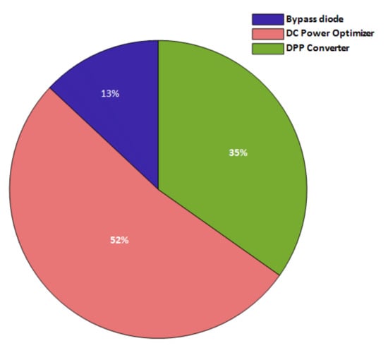 In continuation, a comparison among the above-discussed topologies in terms of the number of electrical components, complexity in their circuit, analysis of the cost of the topology, the complexity required to control the converter, requirement of local or global MPPT control strategy, and losses/overall efficiency are given in Table 6. The parameters discussed in Table 6 depend upon the number of circuit components in each topology, including both active as well as passive. The increase in circuit components also enhances the control complexity, which becomes a reason for using complex control strategies. The number of the component includes both active and passive circuit elements of the mismatch mitigation topologies, which are based on the implementation of a single solar PV module containing three series-connected PV sub-modules. As depicted in Table 6, 12x components are required for DC optimizers and 8x for SC-based DPP topology, where p is the number of PV modules in the system. Overall, the cost and losses in the system are increasing because they are directly dependent on the number of electrical components, i.e., passive as well as active. Finally, the efficiency of the topologies depends on the overall power seen at the output after all losses, considering the system is under mismatch and no mismatch. Furthermore, the number of bypass diodes, capacitors, inductors, and MOSFETs required for the 2.2 kW PV system equipped with bypass diode, DC optimizer, and DPP converter methodologies are given in Table 7. Overall, there are nine 245 W PV modules in the system, and the total electrical component count distribution among them is shown in Figure 18. In Figure 18, the maximum numbers of components are in DC optimizers (52%), while the bypass diode and DPP converter are 13% and 35%, respectively.