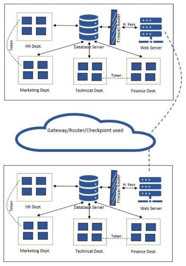 In the architecture proposed by this study (refer Figure 1), one main server is used in each organization or enterprise. A total of two main servers and two communicating servers are required for sending packets or sharing data. There are four departments in each enterprise, for a total of eight departments, with 16 users in the first enterprise and 15 in the second one. Two firewall routers, either a Cisco router or a simple checkpoint device, are attached between the main server and the web server. Their main responsibility is to protect data from unauthorized access. Figure 1 shows the enterprise-level architecture in a multi-tenant environment.