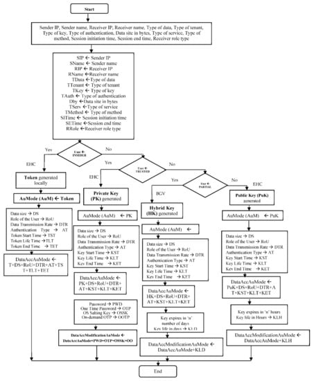 The authentication mode uses a hybrid key, and the data access authentication mode requires a hybrid key and parameters such as data site, data transmission rate, authentication type, key start time, key lifetime, and key end time. For a partial user, the token should expire automatically after “n” number of days, due to security concerns. In the data access modification authentication mode, changes take place: the parameters are updated in the database after they are processed. The data access modification authentication mode is a combination of the data access authentication mode parameters and the hybrid key and key life in days. The last case is a type of outsider un-trusted user, which is a guest user. This category of users is considered as the least secure category among all those that are available.