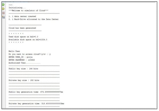 In our model, a multitenant cloud environment is created using the CloudSim simulator and Netbeans. The authentication and authorization of tenants are evaluated in accessing a file in the cloud. Our model asks for the credentials of the user or tenant, and only after validating the credentials is a tenant able to access the cloud. The total number of bits required by public and private keys, and the times taken by these keys, are evaluated. Figure 3 shows the time and size of the generation of EHC keys. The time is calculated in nano seconds (ns). The public key size is 144 bits, while the private key size is 152 bits.