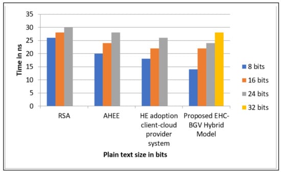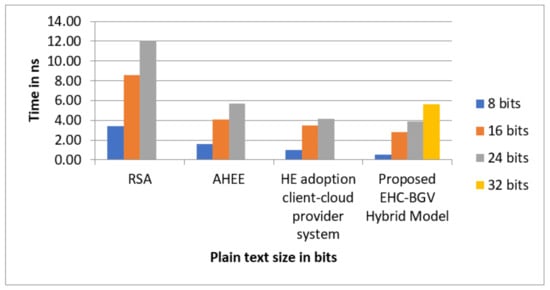 Table 2 shows a comparison study of the existing approaches and the proposed hybrid approach, taking into consideration the ciphertext that is used for data transmission via cloud enterprise-level servers. Figure 5 shows a graphical representation of the interpretation, based on the size of the ciphertext compared with those of the existing models, RSA, AHEE, and HE, that adopted a client–cloud provider system.