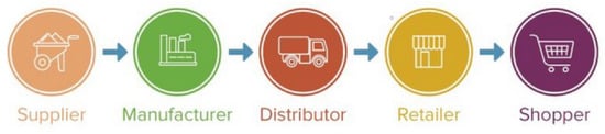 A supply chain, Figure 1, is a connected system of organizations, activities, information, and resources designed to source, produce, and move goods from suppliers to end customers. Modern SCs are a network of IT infrastructures and technologies that are used to connect, build, and share data [], inadvertently giving rise to new forms of risk since they are not connected to physical products or physical locations. Despite the high socioeconomic importance of SCs, there is no straightforward way to protect their infrastructures from cyber threats, which are becoming increasingly prevalent and sophisticated in their execution []. Thus, SCs are in a state of constant refinement of their security capabilities in order to address their vulnerabilities [,,].