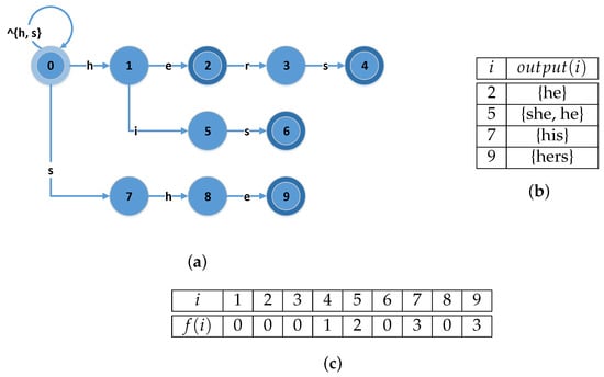 The goto function (Figure 2a) determines if a state transition can be performed, based on the current state and the ASCII value of the input character. If the input character matches one of the transitions starting from the current state, then the state pointed to by this transition becomes the next state. Otherwise, the next state is resolved by the failure function . For example (based on Figure 2a), the edge labeled h from 0 to 1 indicates that , while the absence of an arrow for a indicates failure. The failure function either drives a transition to one or more intermediate states, or to the initial state (the one that is represented with 0 in the goto graph). After each state transition, the algorithm checks the output function in order to determine if the pattern matches a sub-string of the text T. This procedure continues and terminates at the end of the input text T. Since failed transitions may not consume any input—the so-called -transitions—the produced automaton is non-deterministic (NFA). Additionally, the failure function can result in numerous state transitions for a single input character. In this way, the matching operation might require the exploration of multiple paths before the actual match of a pattern. A revised version of the traditional Aho–Corasick exists and replaces all failure transitions in order to avoid the performance loss, when the patterns’ sizes are large. The new automaton that is produced is called “deterministic finite automaton” (DFA) and provides one transition per state and input character. Despite this approach requiring more memory than the previous one, it is more efficient in terms of processing throughput. The achieved complexity of this approach is .