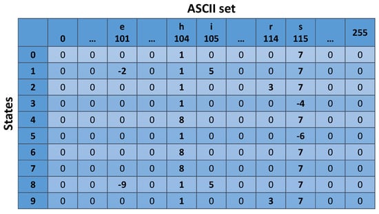 During the bootstrap phase, the various signatures are processed by a simple parser. The purpose of the parser is to identify the signatures and process the binary notations, if any. When all the available patterns are gathered and processed, they are compiled into a single Aho–Corasick DFA, constructed as a tree. The next step is to serialize the produced tree as a two-dimensional integer array. This array will have 256 columns, which represent the size of the ASCII set, and N rows, where N is the number of the states in the DFA. Each row represents a DFA state and each cell contains the number of the next valid transition, corresponding to the ASCII character that the cell represents. An example of this array can be found in Figure 3.