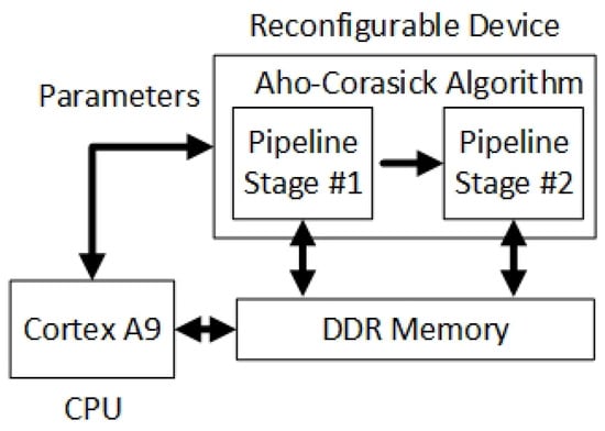 The mapped Aho–Corasick architecture consists of a pipeline architecture, as presented in Figure 4. The system input (i.e., the incoming network packets) is streamed and stored by a Cortex A9 processor to the onboard DDR memory. Additionally, the onboard DDR memory stores the predefined structure, i.e., a tree-based data structure, of the rules that defines the “suspicious” network packets. Then, the processor passes to the reconfigurable device the parameters that are used for running the Aho–Corasick algorithm (e.g., the number of stored rules and the the input data size that is going to be processed).