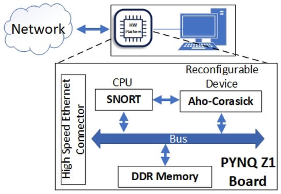 As presented in Section 2, the Aho–Corasick algorithm has been mapped on various HPC reconfigurable platforms. This work offers the first implementation of the Aho–Corasick algorithm on a modern, inexpensive, and low-resources FPGA platform, i.e., PYNQ Z1. The goal of mapping Aho–Corasick on such platform type is the easy integration of the system into a complex environment such as supply chains. Additionally, this implementation focuses on low-cost intrusion detection systems for such huge environments. Last, the goal of mapping the Aho–Corasick algorithm on a reconfigurable platform is based on the fact that FPGAs can offer a high-performance solution for the pattern matching problem.