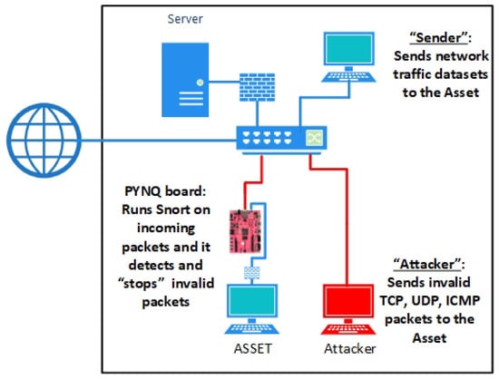 The performance of the proposed framework was evaluated against several network traffic datasets over an emulated supply chain infrastructure. Specifically, the PYNQ board hosting the reconfigurable Aho–Corasick implementation was connected in between a local PC (referred to as the asset) using one Ethernet port and an emulated “external” network using the second port. Other network PCs communicated with the protected asset directly through the network. Based on the test scenario, the local PCs sent either “invalid/suspicious” packets, which triggered alerts by the PYNQ board, or “valid/benign” network packets, which arrived normally to the protected asset. The PYNQ board, which hosted the online IDS module, checked all the incoming packets and it either sent log alert messages to the server console when an issue appeared or allowed the packets to continue onto the asset. Four different real-world network traffic datasets (i.e., [,,,]) were used to evaluate the proposed framework. The datasets consist of various network packet types (i.e., TCP, UDP, and ICMP) with fluctuating sizes (64 bytes up to 1500 bytes). All datasets are related to Industrial IoT (IIoT) for evaluating the fidelity and efficiency of cybersecurity applications. The structure of the emulated supply chain, which was used for system evaluation, is presented in Figure 7.