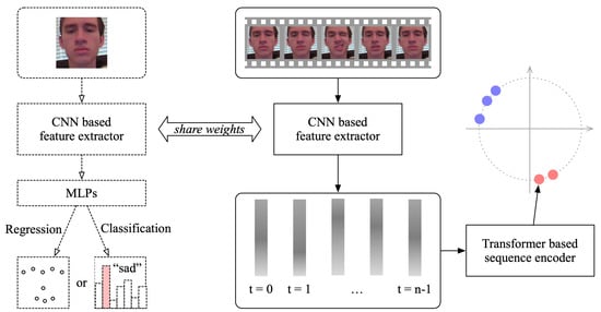 The most related research topic to our work is video-based facial expression recognition (FER). With the development of deep learning technologies, the-state-of-art performance on the CK+ dataset [], a popular benchmark on video-based facial expression recognition, reached an impressive 99.69% overall accuracy []. Comparing to the image-based FER approaches [,], which use deep convolutional neural networks (CNNs) extensively to train a classifier, video-based FER use specific neural network architectures to extract the temporal information across frames. For example, [,,] used 3D CNN in their models, and [,] both adopted the attention mechanism, which was initially designed for machine translation task []. Similar to facial expression recognition, other tasks such as micro-expression recognition [], implicit preference estimation [], and facial nerve paralysis evaluation [], also take advantage of short face videos and run facial motion analysis over consecutive frames.