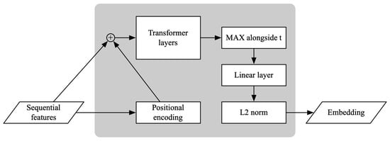Figure 3 shows the design of our sequence encoder. For the input sequential features, it calculates the positional encoding at first, adds this encoding to the input sequence, then feeds the position-coded sequence to the stacked transformer layers. Each transformer layer includes a self-attention module and a feed-forward layer. The output of the transformer structure has the same shape as input, , where L is the sequence length and m is the vector space dimension determined by the output layer size of MobileFaceNet. Instead of only paying attention to the feature vector at each sequence end, our encoder selects the maximum value of elements alongside the time axis. As the input sequence of the stacked transformer layers is position-coded, the output of this max-pooling operation still preserves the ordering information of sequence. Then, these variable-length outputs all collapse to a vector in . The final linear layer in sequence encoder projects the vector from to , where n is the target size of facial motion embedding.