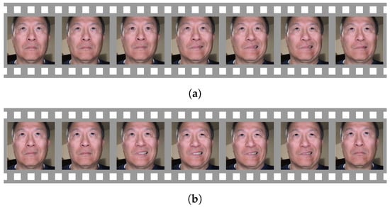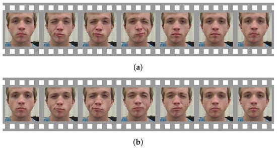 False negative example with significantly different facial motion intensity. Subject considers (a,b) as the same motion. Beside the intensity change on lips, (b) also has the left eye always opened.