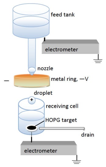Upon the flow of water through the plastic pipe and the tip, an electric charge was generated in it owing to a triboelectric effect [29,30,31,32,33,34,35,36,40,41]. The electric field, organized around the tip, induced charge separation in water. Therefore, upon application of a negative voltage to the metallic ring, the negative charge under the action of the electric field flows down to the ground through the channel supplying the solution (in the form of an upstream), while the positive charge remains on the drop and, when it is detached, enters the receiving cell. In this way, the water droplets become an excess electric charge of a sign opposite to the potential applied to the metallic ring [42]. Dropwise water flowed into the measuring cell, provided an ohmic break in the electrical circuit, and temporarily prevented the positive charge, borne by the droplets, from draining. It is very important to ensure that the feed tank is well-grounded; otherwise, the charge separation in the area of the tip nozzle occurs in an unpredictable way. Moreover, the HOPG substrate in the measuring cell must also be grounded. The charged droplet falls onto the HOPG substrate in the cell, and the charge is drained to the ground. The amount of the drained charge was measured in both cases with highly sensitive electrometers (nanocoulomb meters, home-made in IBMC, Moscow, Russia). The charge drained from the feed tank must be equal in value and opposite in sign to the one drained from the HOPG substrate. If this is not the case, then there is a reason to check the system for current leakage. Such a system is well known; the main characteristics and equations describing the dependence of the magnitude of the induced charge of a drop on the physical and geometric parameters of a Kelvin dropper are given in [37].