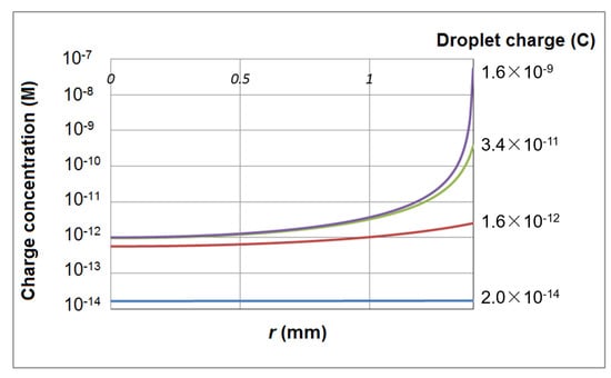 Calculated dependencies of the volume concentration of elementary charges on the distance from the center of the droplet. The droplet diameter is 2.8 mm (accordingly, its radius is r0 = 1.4 mm).