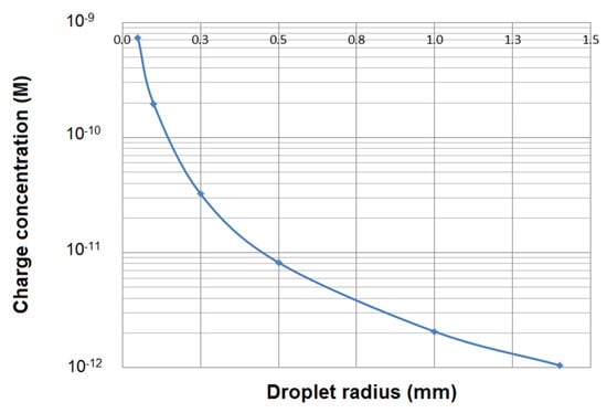Then, we have calculated the dependence of the volume concentration of elementary charges on the distance from the center of the droplet. This dependence is shown in Figure 3.