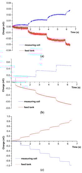 In our experiments, we observed that at −3 kV applied to the ring, +0.2 nC of positive charge entered the measuring cell with every droplet. Figure 4 displays the time dependencies of the charge entering the measuring cell with the water droplets (blue curves) and returning to the feed tank (red curves) at various voltages applied to the ring.