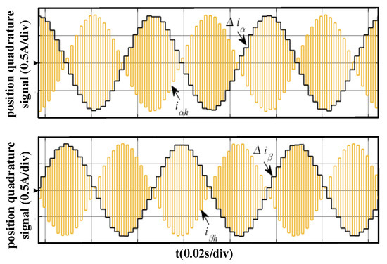 where ∆iαh and ∆iβh represent the envelopes of the two HF response currents in the stationary coordinate system, respectively; Lavg = (Ld + Lq)/2, Ldif = (Ld − Lq)/2, represents the amplitude. The magnitude is , and the direction of the voltage changes with the periodic positive and negative changes of the injected square wave; ωh is the frequency of the injected HF signal. When the estimated position error is approximately zero, the envelope ∆iαh and ∆iβh approximation have a positional quadrature relationship.