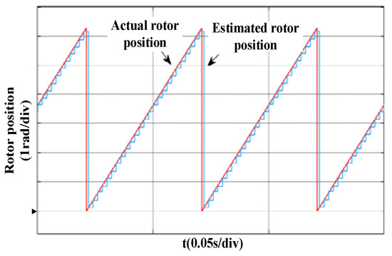 It can be seen from the Figure 5 that although the position quadrature signal can be accurately extracted based on the sampling rate transformation process, due to the low injection frequency, the obtained position quadrature signal changes in steps and has serious distortion, which will lead to obvious steps in the subsequent position estimation and eventually affect the stability of the system. In addition, when the selected square wave voltage injection frequency is reduced, the discretization of the extracted position quadrature signal will be more serious. As shown in Figure 6, it is the estimated rotor position calculated by directly using the position quadrature signal.