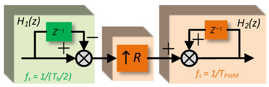 In order to solve the above problems, in this section, a frequency-matching method based on CIC interpolation filtering is proposed to interpolate and to match the frequencies of the discrete signals, so that the interpolated quadrature signal has an update frequency consistent with the switching frequency, and the waveform is more continuous and complete. As shown in Figure 7, it is the block diagram of single-order CIC interpolation filter. As can be seen from Figure 7, the filter is composed of a comb filter H1(z) and integrator H2(z) in cascade. It only contains addition and subtraction modules, so it has the advantages of simple structure and low complexity [29]. In addition, the CIC filter is a multi-rate low-pass filter, which is suitable for sampling rate conversion. It can not only realize the extraction from high rate to a low rate, but also realize the interpolation from low rate to high rate.