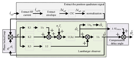 It can be seen from the above formula that the rotor position is included in the HF response current envelope θe. Therefore, the HF response current can be extracted from the feedback current, the rotor position information can be obtained by using the appropriate demodulation method, and the rotor position and mechanical angular velocity can be estimated by the observer, so as to finally realize the closed-loop control.