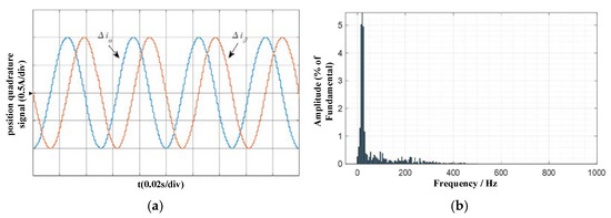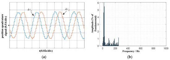 Figure 11 shows the position quadrature signal without CIC interpolation filtering and its FFT analysis diagram, and Figure 12 shows the position quadrature signal with CIC interpolation filtering and its FFT analysis diagram. By comparing Figure 11a and Figure 12a, it can be seen that the position quadrature signal without CIC interpolation filtering has obvious discontinuity, and its harmonic content is richer, which has an adverse impact on the subsequent position estimation and increases the estimated position error. By comparing Figure 11b and Figure 12b, it can be seen that the waveform of position quadrature signal filtered by CIC interpolation is smoother, the harmonic content is significantly reduced, and the interference of HF signal can be well filtered. In addition, after interpolation, the sampling rate of the waveform is increased to the switching frequency, which can improve the calculation frequency of the estimated position, and improve the accuracy of position estimation.