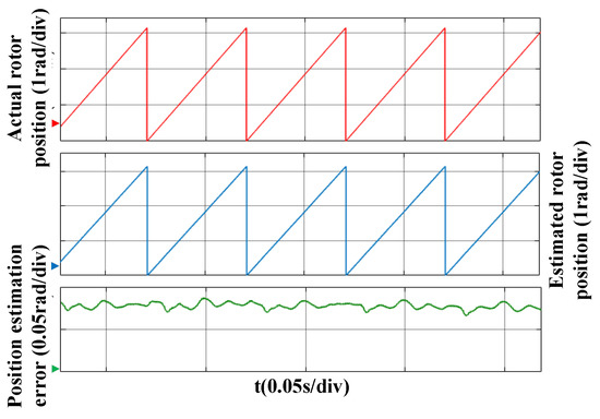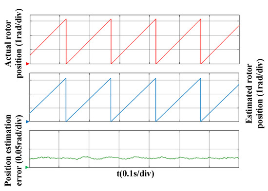 Then, the steady-state performance of the proposed control strategy is tested by simulation. Figure 13 and Figure 14 are waveforms of the estimated position signal reference 100 rpm and 300 rpm under no-load conditions, respectively. It can be seen from the figure that the maximum position estimation error is no more than 0.1 rad, the observer can better estimate the rotor position at different reference speeds. Therefore, the proposed strategy can be well applied to sensorless control in the zero low speed range at 1 kHz low switching frequency.