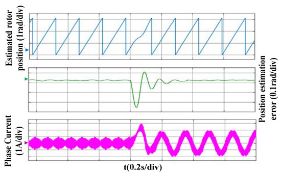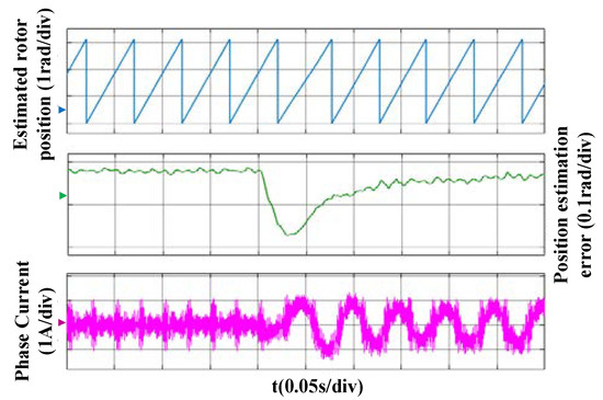 In addition, the dynamic characteristics under the proposed control strategy are tested by simulation. Figure 15 and Figure 16 show the estimated position waveforms and the corresponding phase current waveforms at a reference 100 rpm and 300 rpm in the case of a sudden load of 3 N.m. It can be seen from the figure that in the whole loading process, the maximum position estimation error does not exceed 0.26 rad., Therefore, the control system has strong anti-disturbance under different reference speeds.