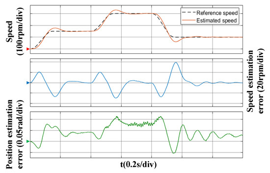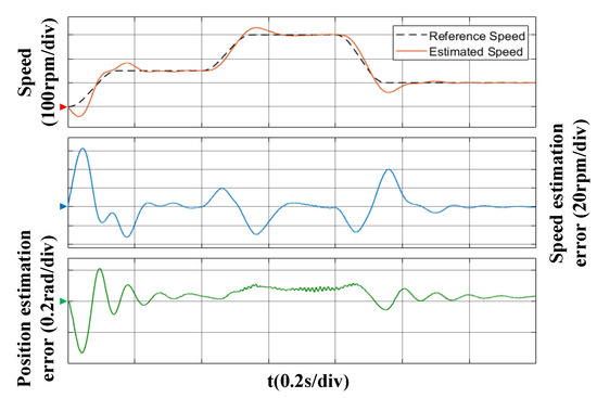 Figure 18 shows the simulation waveform of the motor running with load of 3 N.m. As can be seen from Figure 18, the motor starts from a standstill, and then sets the reference speeds of 150 rpm, 300 rpm, and 100 rpm, and makes a smooth transition between different reference speeds. During the simulation process, since the electromagnetic torque of the motor increases from 0, it will reverse due to the influence of the load torque, but it can quickly track the reference speed, so the system has a certain robustness, and the maximum rotor position error does not exceed 0.34 rad, the maximum speed error does not exceed 63 rpm, and the speed overshoot does not exceed 30 rpm. Therefore, the sensorless control system still has better dynamic performance under load.