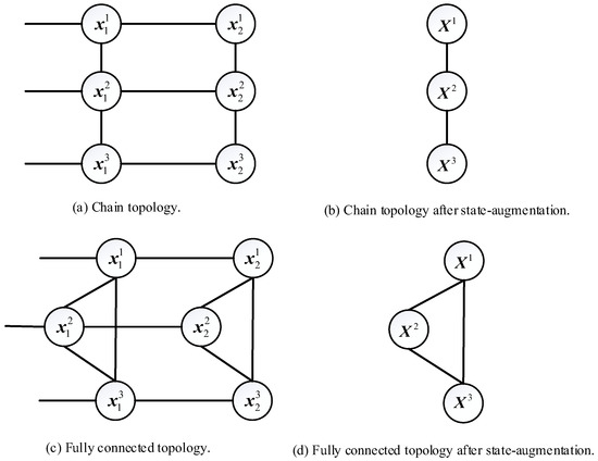 Consider two different agent network topologies, i.e., a chain topology and a fully connected topology, as shown in Figure 2. For brevity, boxes representing the factor nodes are omitted in the factor graphs shown in Figure 2 and we know each link connecting two variable nodes acts as a factor node. Figure 2b,d show the factor graphs after state augmentation according to Figure 2a and Figure 2c, respectively. For the chain topology shown in Figure 2a, the factor graph after state augmentation is loop-free as shown in Figure 2b, and thus an accurate conditional marginal pdf can be obtained without any iteration. For the fully connected topology shown in Figure 2c, loops both at one time instant and across time exist. After stat-augmentation shown in Figure 2d, only one loop is left. Iterations are still needed in the BP for Figure 2d since there is still a loop. However, it is intuitive that the BP on the augmented state (shown in Figure 2d) outperforms the BP acting on the fact graph shown in Figure 2c since the number of loops is significantly reduced.