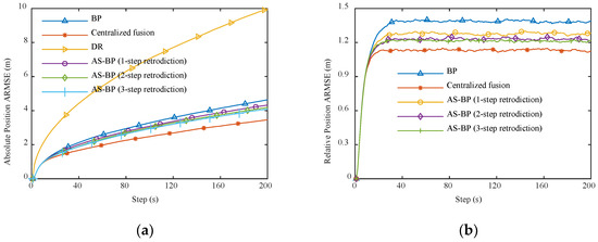 From Equations (18)–(21), it can be seen that the BP algorithm, for each agent in each iteration, needs to calculate the belief and the outgoing message based on the incoming messages from all neighboring agents and its own prediction message . The computational complexity of the BP algorithm increases linearly with the scale of the network. Our proposed algorithm utilizes state augmentation to realize messages backward propagation, which capably retains the excellent characteristics of the BP algorithm. However, due to the use of state augmentation, the computational cost inevitably increases. Compared with the BP algorithm, the computational cost of the proposed algorithm increases linearly with the number of retrodiction steps. By using state augmentation, the computational time of AS-BP increases along with the retrodiction step compared with original BP. The computational complexity is generally , where is the dimension of relative measurements and is the number of retrodiction steps, since matrix inverse is involved in Equations (30) and (31). This nonlinear increase of computation can be avoided by a sequential (or recursive) implementation of the update of the Kalman filter due to the uncorrelated assumption of relative measurement noises [32]. With such an implementation, the computational time of AS-BP increases linearly with the retrodiction step, since it is equivalent to say times of filtering of original BP are needed in the AS-BP. On the other hand, if the batch form of update in Equations (30) and (31) is directly used in the implementation of AS-BP. The computational time still shows nearly linear increase along with the retrodiction step , when is relatively small. This is due to the fact that the nonlinear part of the matrix inverse is not dominating in the whole filtering procedure.