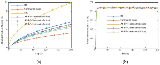 The absolute position refers to the position in the fixed global coordinate system, and the relative position refers to a moving coordinate system taking the position of agent 1 as the origin. For the chain topology, the number of iterations is set to be 3 for both the AS-BP and the BP. For the fully connected scenario, it is set to be 5. All simulations have performed a total of 5000 Monte Carlo runs. The simulation results are shown in Figure 3 and Figure 4.