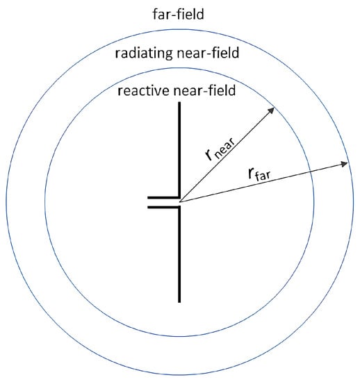 For electromagnetic systems with alternating or pulsing currents, radiation effects arise. Consequently, every conducting structure with this kind of current can act as an antenna. To understand the radiation behavior and impact on neighboring elements, knowledge about the field properties around these radiating structures is crucial. A rough classification of the field behavior is made by introducing so-called field regions [1]. In doing so, the surrounding volume of the antenna is distinguished into three regions, described by a distance to the antenna itself. As shown in Figure 1, the immediate surrounding, enclosed by a sphere with the radius , is called the reactive near-field (NF). According to [1] (p. 23), the reactive energy predominates here. The next region, limited by a sphere with the radius , is called the radiative NF. In this region, the reactive field has mainly vanished, and the radiation behavior of the antenna is formed. Therefore, it is also called the transition zone. Outside , the far-field (FF) is located, where the angular field distribution is independent of the radius [1] (p. 15).